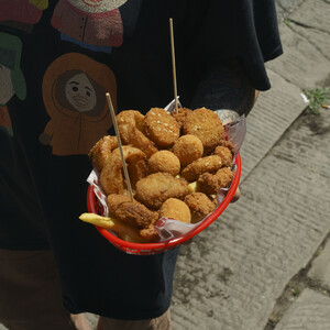 Pop corn di pollo, bocconcini di camembert filante, anelli di cipolla pastellati alla birra con patatine.