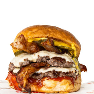 Doppio hamburger di manzo scelto, doppio edamer, doppio rigatino croccante, cetriolini, ketchup e senape