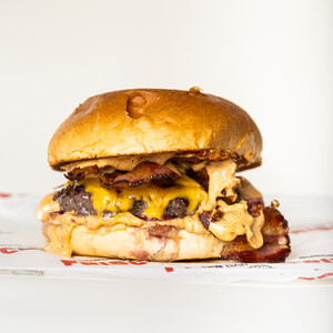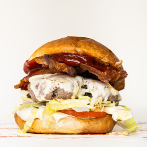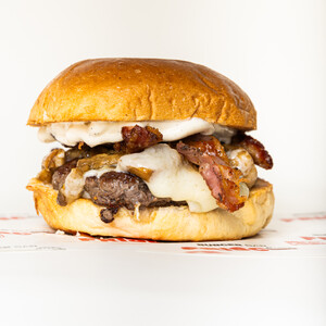 Burger di manzo piemontese, cheddar, bacon, cipolla caramellata, salsa Frisco