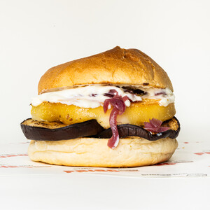 Medaglione di scamorza filante, melanzane grigliate, cipolla caramellata, maionese al lime