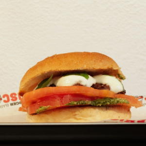 burger di manzo piemontese, mozzarella fior di latte, pesto senz'aglio, pomodoro fresco, basilico.