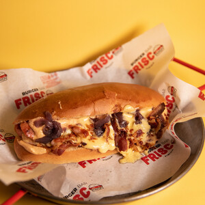 würstel artigianale, crema di cheddar, cipolla caramellata, salsa Frisco, briciole di bacon croccante