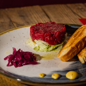 tartare di manzo leggermente condita, servita con cipolla caramellata, pane bruschettato, senape dolce