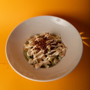 Insalata iceberg, tagliata di pollo, pane croccante, dressing fresco della casa, briciole di rigatino croccante, cipolla caramellata e semi misti